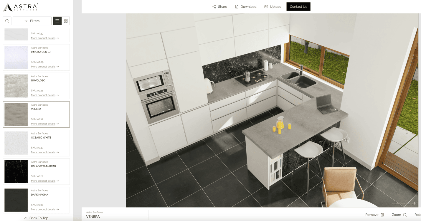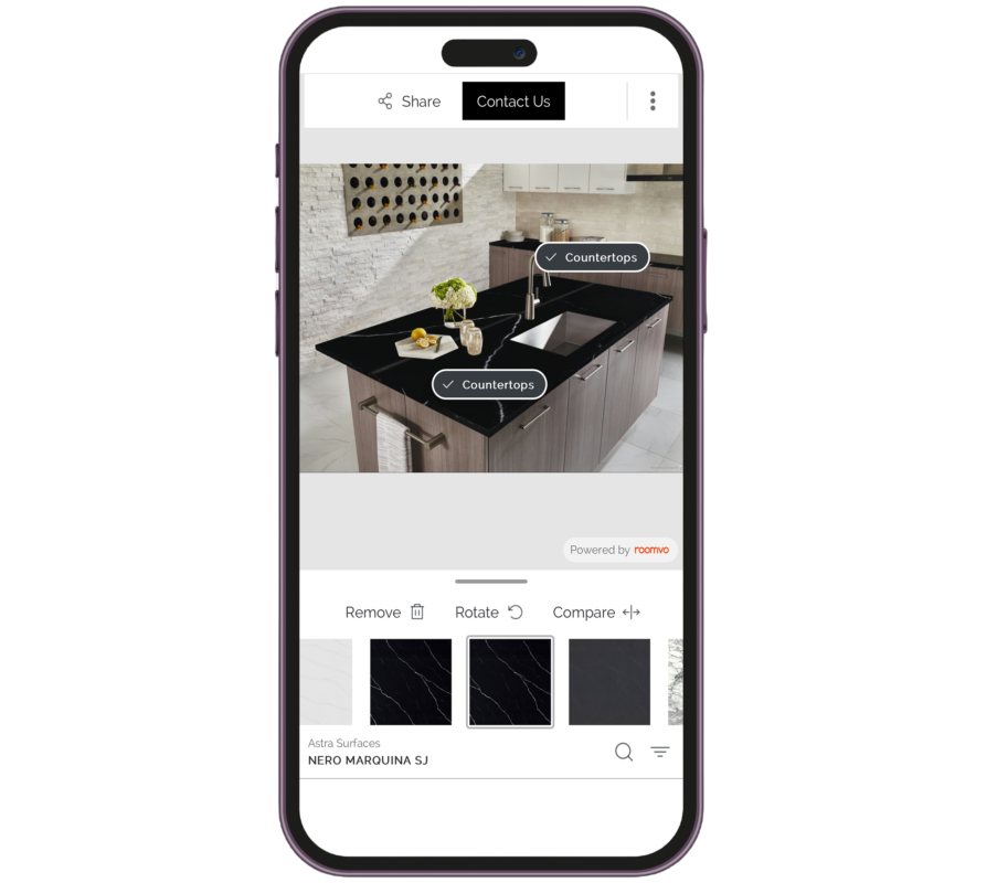 With our Visualizer Tool, you can easily explore how different quartz and Natural Stone surfaces will look in your home or office. Simply upload a photo of your space—whether it's your kitchen or bathroom—and begin experimenting with a wide selection of Variant Quartz® slabs and Natural Stone. This interactive tool allows you to visualize countertops, backsplashes in real time, helping you make confident decisions about which stone best suits your style and needs